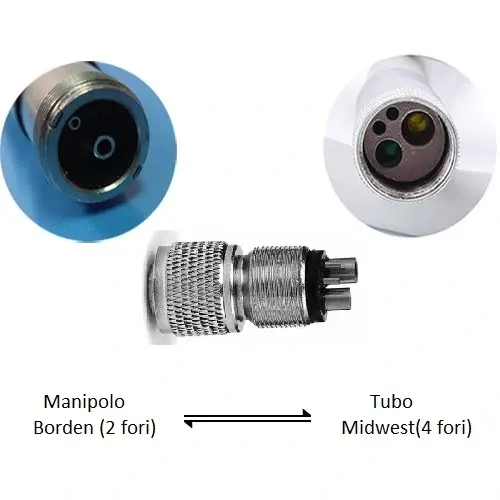 - L’adattatore è progettato per essere compatibile con strumenti dentali che presentano una connessione Borden, caratterizzata da due uscite. Questa caratteristica consente agli operatori dentali di utilizzare le loro turbine e micromotori preferiti, indipendentemente dalla tipologia di connessione.