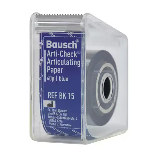 La Carta articolazione rotolo blu BK15 di Bausch è uno strumento ultrasottile progettato per rilevare con precisione i contatti occlusali e le forze masticatorie. Con uno spessore di soli 40 µm, questa carta occlusale è ideale per registrare anche i minimi dettagli dei punti di contatto, garantendo un controllo accurato durante le procedure odontoiatriche. Fornita in un pratico rotolo da 10 metri con un’altezza di 22 mm, è racchiusa in un distributore che facilita l’utilizzo e l’applicazione rapida della carta. Grazie alla colorazione blu intensa, i contatti sono facilmente identificabili, rendendo immediato il riconoscimento di eventuali interferenze.