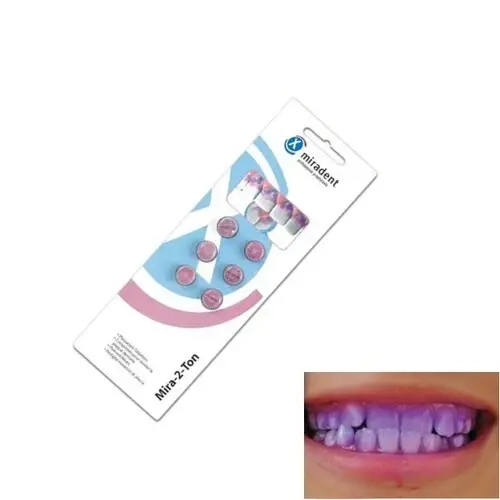 Le compresse mira-2-ton sono un dispositivo odontoiatrico progettato per evidenziare la presenza di placca batterica sui denti, distinguendo tra placca recente e placca più vecchia. Grazie alla tecnologia bi-tono, la placca recente si colora di rosa, mentre la placca accumulata di lunga data appare blu scuro. Questo sistema visivo facilita l’identificazione delle aree da trattare durante la pulizia dentale, rendendo il prodotto un alleato per dentisti, igienisti dentali e pazienti che desiderano monitorare l’efficacia della propria igiene orale. Le colorazioni sono facilmente rimovibili con un normale spazzolamento dei denti. Le compresse sono prive di eritrosina (E127) e glutine, rendendole sicure per un’ampia gamma di utenti, inclusi coloro con sensibilità a questi componenti. La loro facilità d’uso e l’efficacia dimostrata negli studi dentistici le rendono un prodotto affidabile e motivante per migliorare le abitudini di igiene orale.