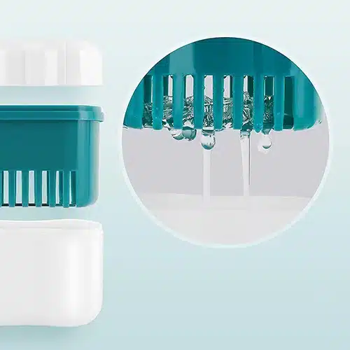 - Il cuore di questo contenitore è il gocciolatoio interno, un elemento progettato per agevolare la pulizia delle dentiere. Questo componente consente al liquido o alle soluzioni di defluire facilmente, facilitando il risciacquo e l’asciugatura delle protesi in modo efficiente.