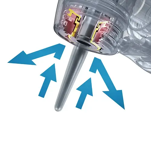 - Impugnatura snella per un accesso agevole ai molari, evitando il contatto con i denti anteriori.