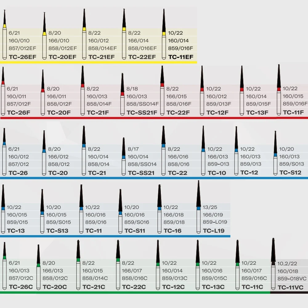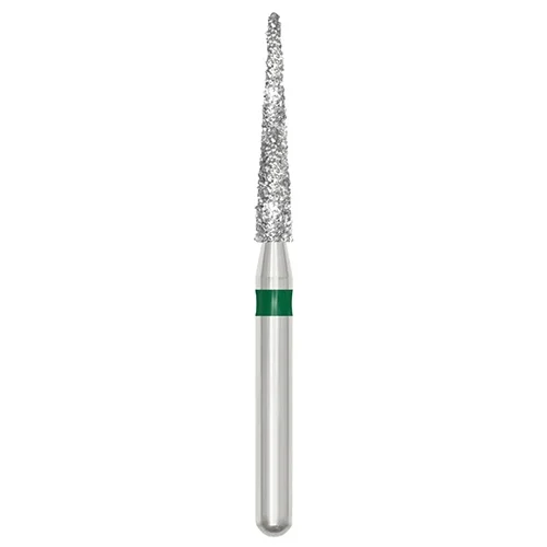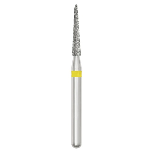 Le frese coniche, in particolare nella versione TC (conica appuntita), sono indicate per preparazioni assiali, apertura degli spazi interprossimali e rifinitura delle spalle. La geometria affusolata consente un accesso controllato anche nelle zone più strette, favorendo precisione nei margini e una preparazione più lineare delle superfici. La disponibilità di diverse granulometrie permette di modulare l’azione di taglio in base alla fase clinica, dalla riduzione iniziale fino alla rifinitura.