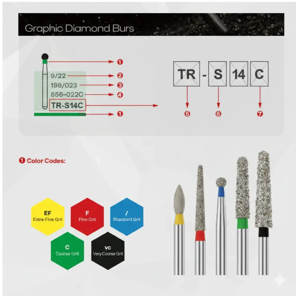 Scegliere D-Perfect significa affidarsi a una codifica ISO chiara e standardizzata, a materiali selezionati e a una gamma completa di diametri e grane compatibili con tutte le turbine FG. È una soluzione affidabile per il professionista che ricerca efficienza, coerenza di prestazione e un corretto equilibrio tra qualità tecnica e convenienza operativa.