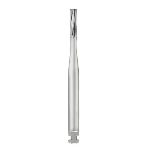 - La fresa presenta una forma cilindrica a punta piatta che offre una superficie di lavoro ampia e uniforme. Questa geometria consente una maggiore precisione nella preparazione delle cavità e nella rifinitura delle superfici dentali.