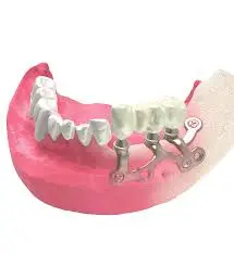 • elemento protesico: l’elemento protesico è la parte visibile dell’impianto subperiostale e viene fissato alla struttura metallica. Può essere una protesi dentale parziale o completa, a seconda del numero di denti mancanti da sostituire.