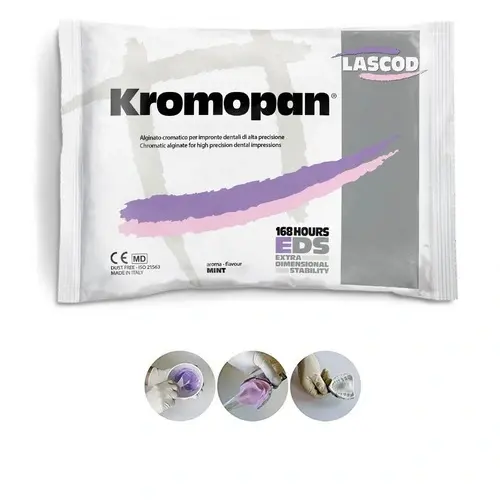 Le impronte prese con Kromopan possono essere disinfettate immergendole in soluzioni disinfettanti specifiche, seguendo attentamente i tempi indicati dai produttori. Questa operazione non compromette le caratteristiche del materiale.