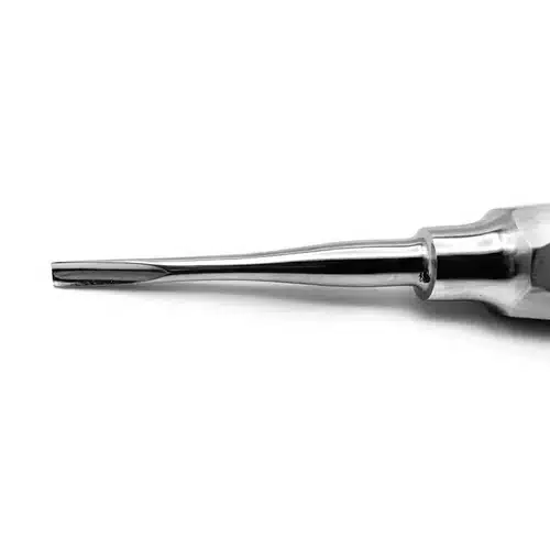 - La leva è dotata di una punta piatta che permette una penetrazione precisa tra la gengiva e l’esterno del dente. Questa caratteristica assicura una penetrazione mirata ed efficiente durante l’estrazione di denti o frammenti di radici.