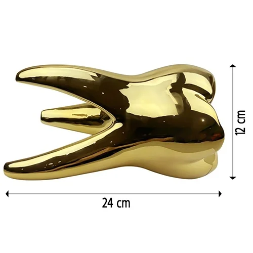 Design realistico: La forma riproduce fedelmente un molare a tre radici, con dettagli curati e una finitura dorata splendente che simboleggia l’eccellenza e la passione per l’odontoiatria.