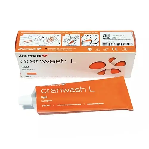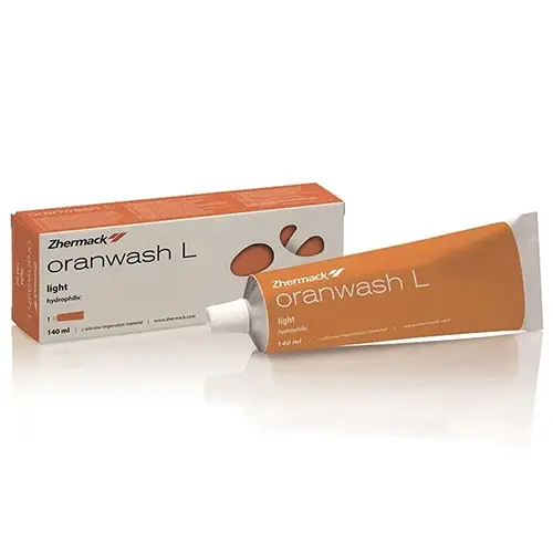 Oranwash light 140ml di Zhermack è un silicone per condensazione altamente idrocompatibile con bassa viscosità e consistenza leggera, parte del kit Zeta Plus. Questo kit comprende 900 ml di silicone Chitos (alta viscosità, consistenza densa), 140 ml di Oranwash (bassa viscosità, consistenza leggera) e 60 ml di Indurent, un attivatore universale. La gamma Zeta Plus è stata la prima linea di silicone Zhermack ed è sul mercato da oltre 30 anni, con un processo di produzione rigorosamente controllato.
