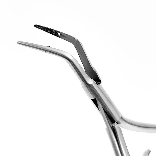 Punta Diamantata Internamente: La parte interna delle branche è rivestita in polvere di diamante per garantire un grip superiore e una presa sicura anche su frammenti metallici lisci o bagnati (come le lime in Ni-Ti o acciaio).