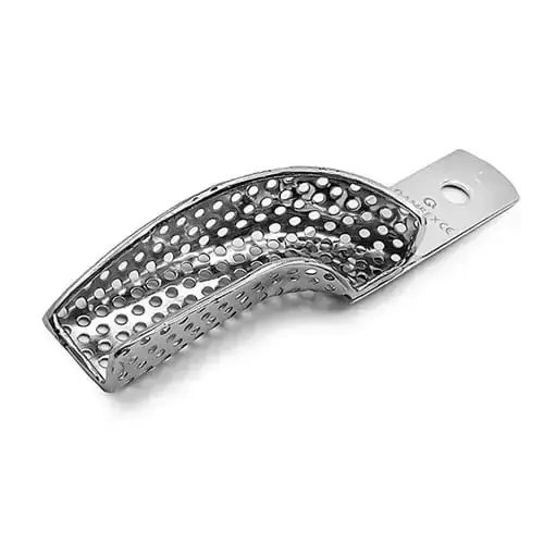 - Il portaimpronta è dotato di perforazioni multiple che consentono una ritenzione efficace e una distribuzione uniforme del materiale da impronta. Questa caratteristica è fondamentale per ottenere impronte dentali precise e dettagliate.