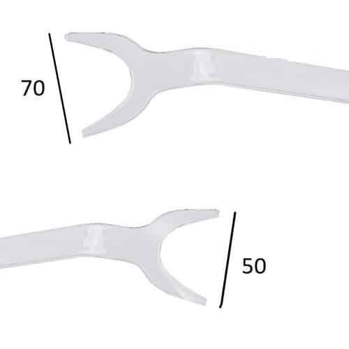 - Il retrattore presenta due estremità con dimensioni diverse, offrendo opzioni flessibili durante le procedure fotografiche. La testa da 70 mm è progettata per la bocca di un adulto, mentre la testa da 50 mm per quella di un bambino.
