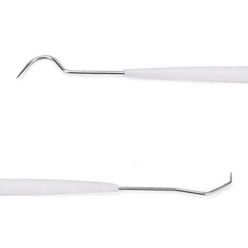1. Testa 1: Una punta sottile e leggermente ricurva, ideale per l’esplorazione delle superfici dentali e l’identificazione di eventuali carie o anomalie. La curvatura consente di raggiungere facilmente aree difficili, come le superfici interprossimali.