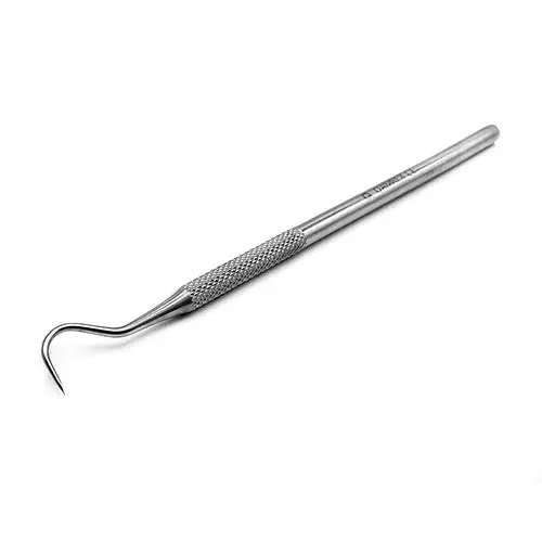 - La parte attiva della sonda presenta una forma di falcetto, ideale per esplorare e ispezionare dettagliatamente il cavo orale. Questa forma consente al professionista di accedere a zone specifiche con precisione, facilitando la diagnosi e la valutazione delle condizioni dentali.