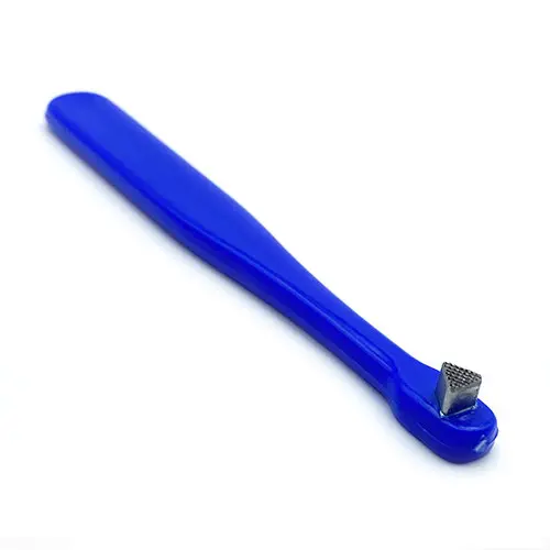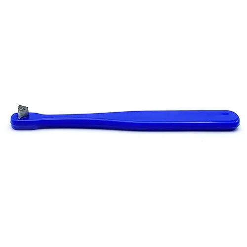 - Il puntale acciaio di forma triangolare, con una superficie zigrinata, è progettato per offrire un’eccellente aderenza durante l’inserimento e l’adattamento delle bande alla corona dentale. Questo assicura una manipolazione precisa e controllata.
