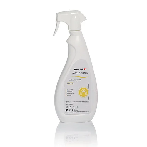 Zeta 7 spray 750ml è un disinfettante specifico per impronte, fornito in un flacone spray da 750 ml pronto all’uso. Formulato senza aldeidi, è ideale per la rapida disinfezione di impronte in silicone, alginato, polietere e polisolfuro, preservando la stabilità dimensionale e la compatibilità con i gessi.